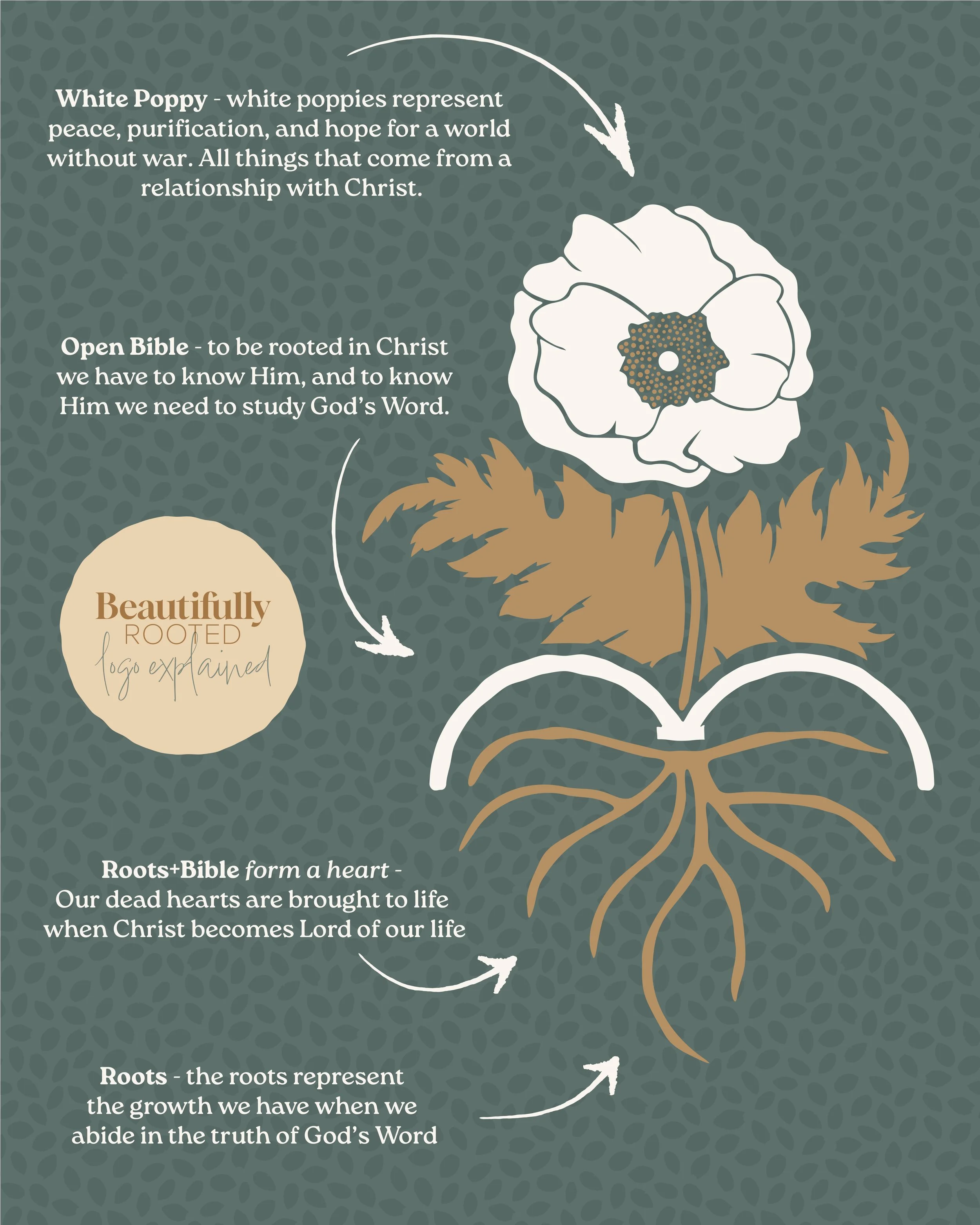 The graphic explains the meaning of the different elements in the Beautifully Rooted logo. Every element was chosen to point to the bigger picture, that True Beauty Blooms When We’re Rooted in Christ!
